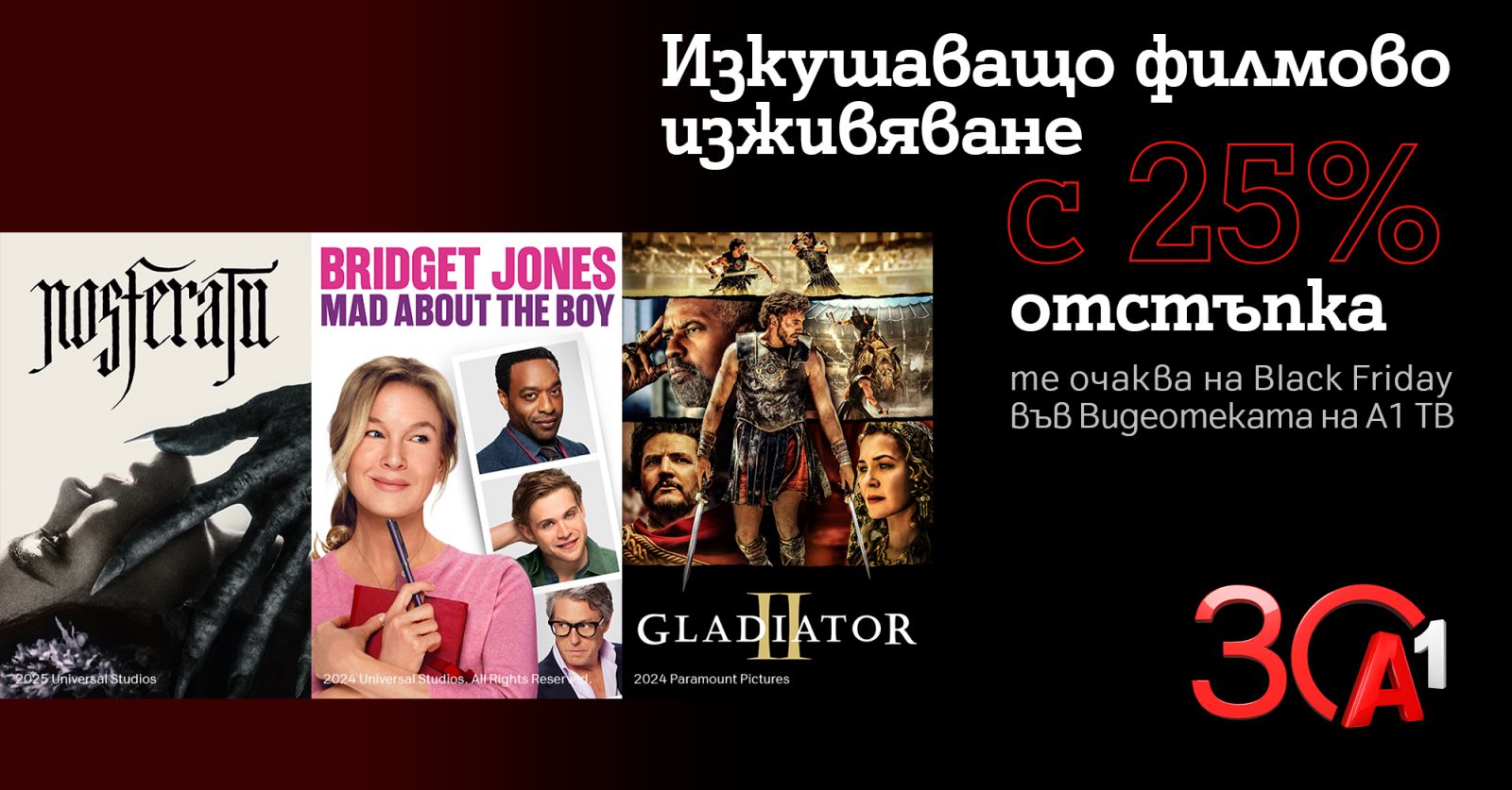 Три от най-очакваните кинозаглавия на годината ще бъдат достъпни за абонатите на Видеотеката на А1 ТВ с 25% отстъпка по случай Черния петък. Промо кампанията стартира на 21 ноември и ще продължи до 1 декември, като избраните заглавия могат да бъдат наемани за 48 часа. Сред включените продукции са хорърът „Носферату“, романтичната комедия „Бриджит Джоунс: Луда по онова момче“, епичният блокбъстър „Гладиатор 2“ и много други.